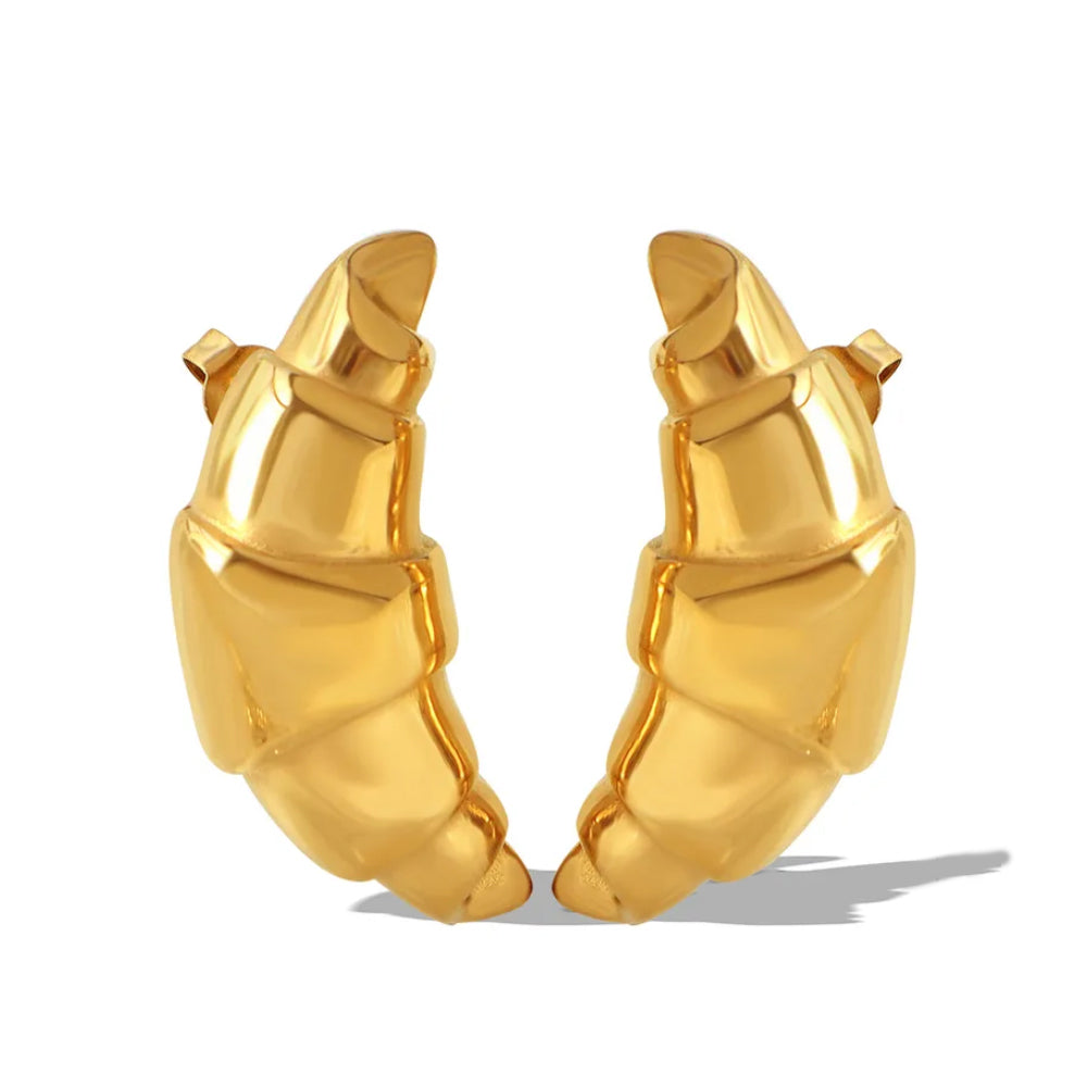Add a touch of elegance to your look with these unique croissant earrings. Made with high-quality materials, these earrings are crafted from 304 stainless steel and coated with 18K gold plating for a luxurious finish. Not only are they anti-tarnish, but they are also water-resistant, ensuring long-lasting wear.
